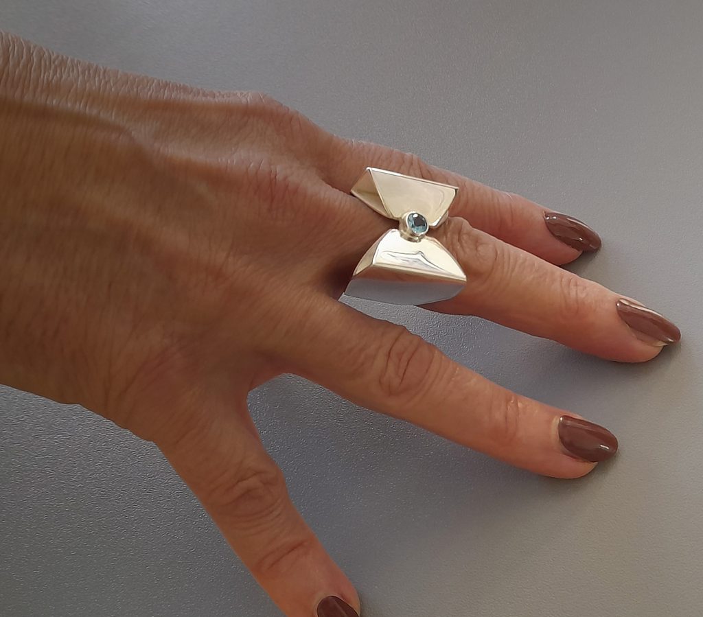 Wie eine Geste, die in Metall erstarrt ist, legt sich dieser außergewöhnliche Ring um ihren Finger. Seine Form erinnert an eine Schleife.-nicht verspielt, sondern bewusst: ein Symbol für Verbindung, für das bewusste Zusammenhalten von Gegensätzen. Offen und geschlossen zugleich, leicht und doch bestimmt. Der Ring ist weniger Schmuck als Kunstobjekt am Finger. Er erzählt von Bewegung , von Eleganz ohne Eitelkeit, von einem Moment de Innehaltens. Die Schleife scheint sich selbst zu umarmen, als würde sie flüstern: Nichts muß fest sein, um Bestand zu haben.