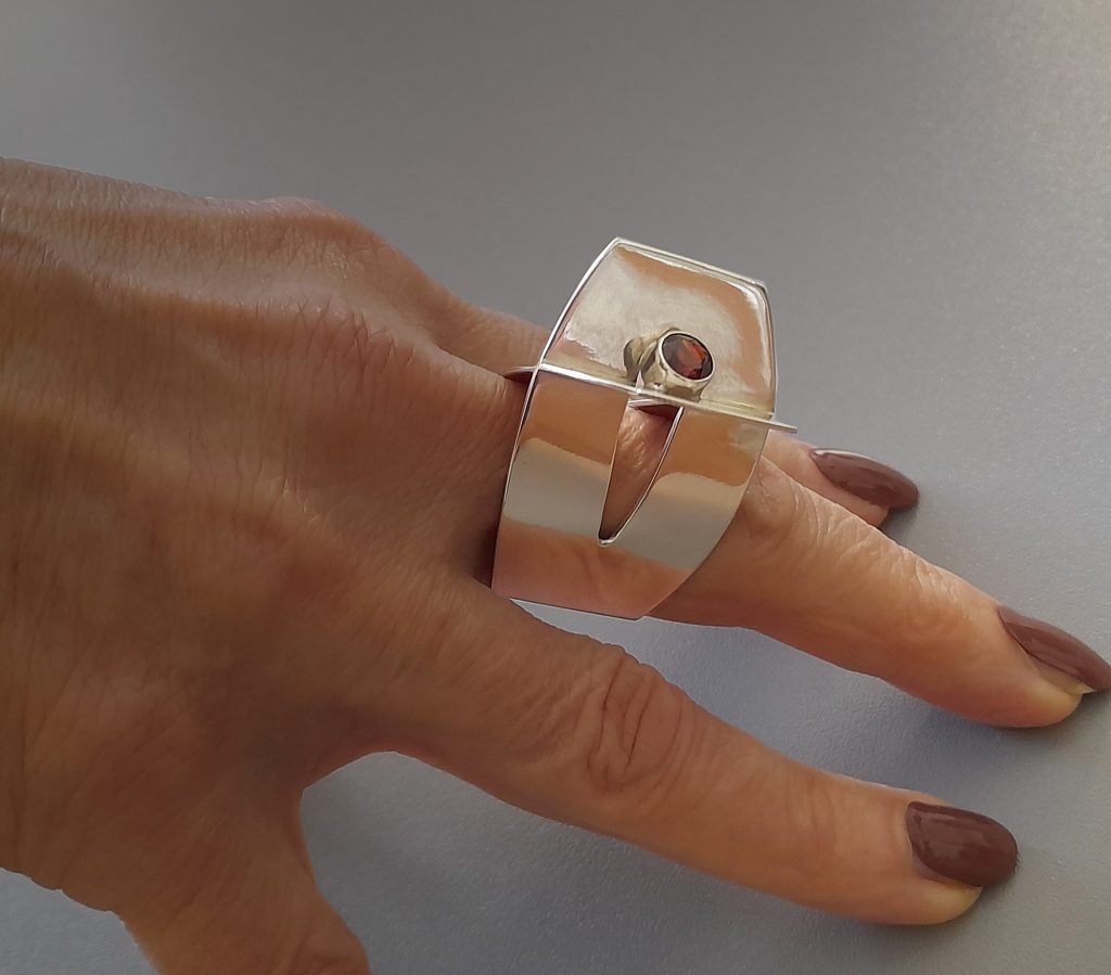 Im Zentrum ruht ein runder, dunkelroter Granat. Tief und geheimnisvoll glüht er wie ein stilles Feuer, eingefasst von der kühlen Ordnung des Metalls. Ein Ring wie ein kleines Universum: kraftvoll und ruhig zugleich, wandelbar und doch beständig – Schmuckobjekt für Menschen, die das Verborgene lieben und Schönheit im Wechsel erkennen.